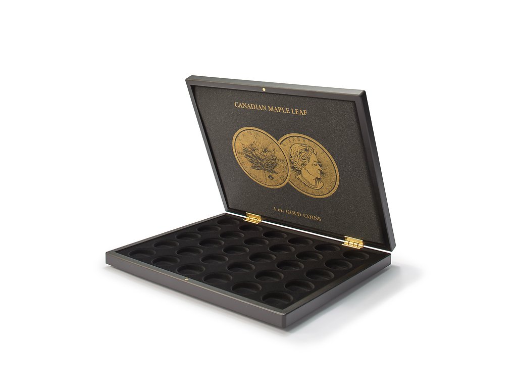 Mincovní kazeta na mince pro uložení 30x Maple Leaf Gold (1oz) v kapslích. Jedna vložka s černým, sametovým povrchem a 30 kulatými poli. Elegantní víko s potiskem polštářku ve zlaté barvě s motivem mincí. Polštářek víka čalouněný černým saténem. Bezpečný a nenápadný magnetický uzávěr.