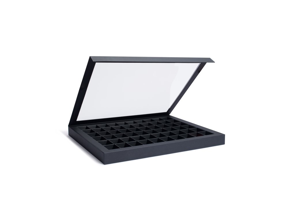 Krabička v minimalistickém designu je vyrobena z robustní matně černé lepenky s pevně integrovanými přepážkami. 60 přihrádek o rozměrech 50 x 36 x 33 mm nabízí dostatek prostoru. Díky designu jsou všechny sběratelské předměty viditelné i při zavřené krabičce. Víko je otevíratelné, má velké průzor a zavírá se nenápadným magnetickým uzávěrem – kolekce je tak dobře chráněna a zároveň atraktivně prezentována. Krabičku lze zavěsit vodorovně i svisle pomocí poutek na zadní straně (montážní materiál není součástí balení).